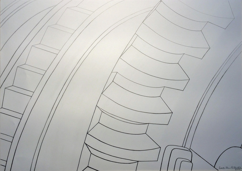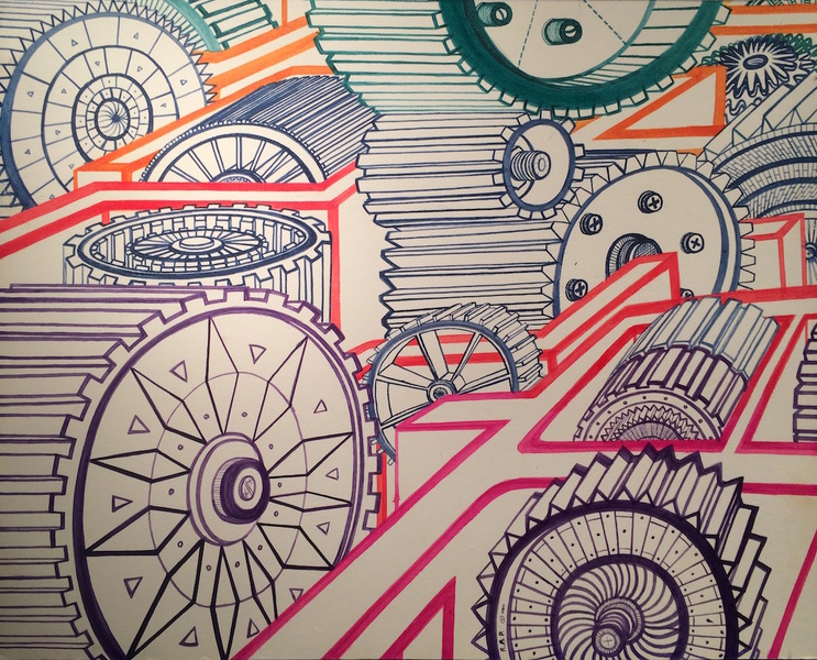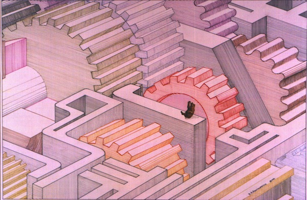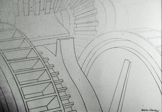 "GEARING", ink on 100% rag paper, 18" x 24", 1989, $100.00